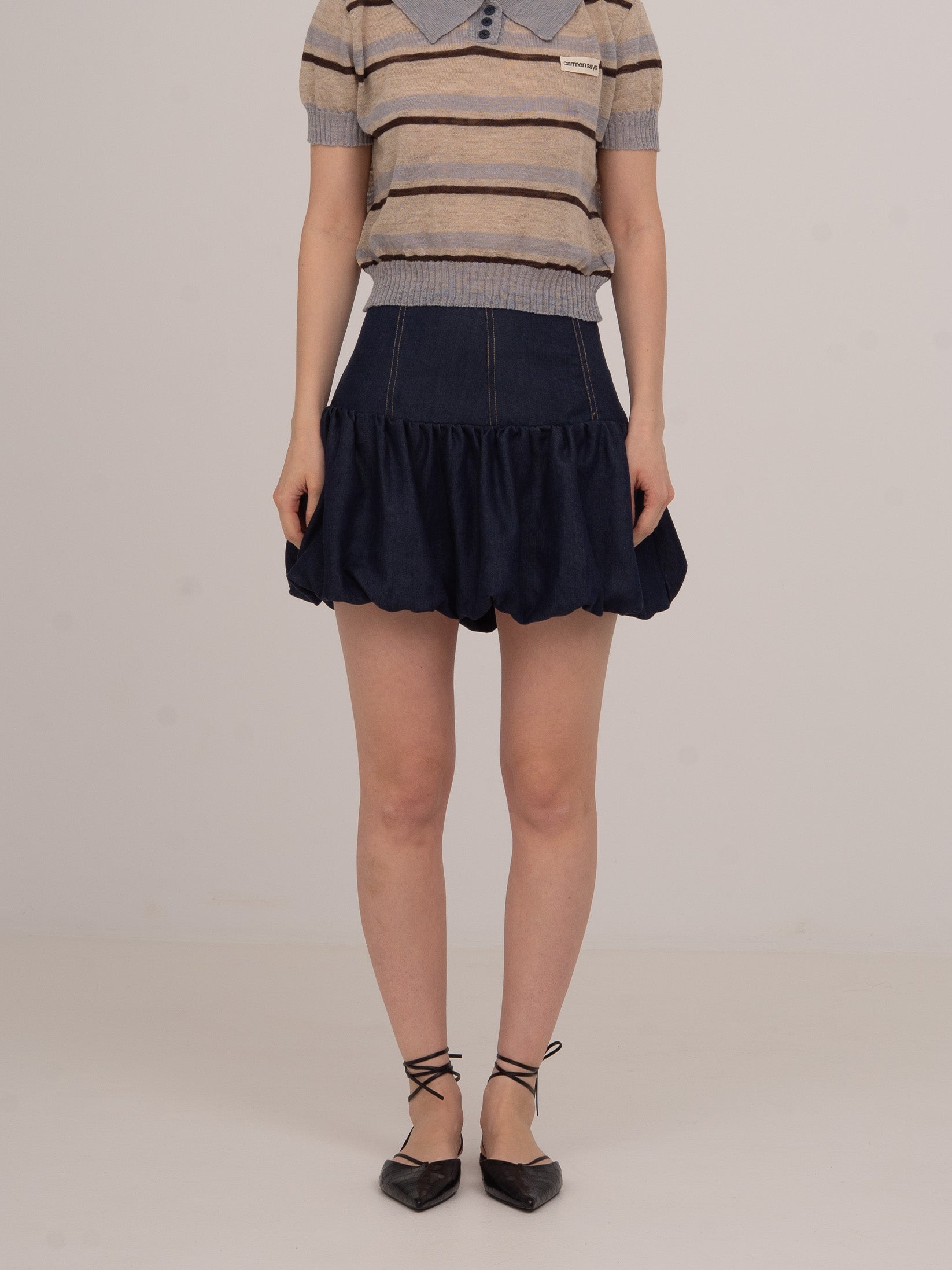 Falda mini denim de cintura alta con diseño tipo globo, femenina y estructurada.