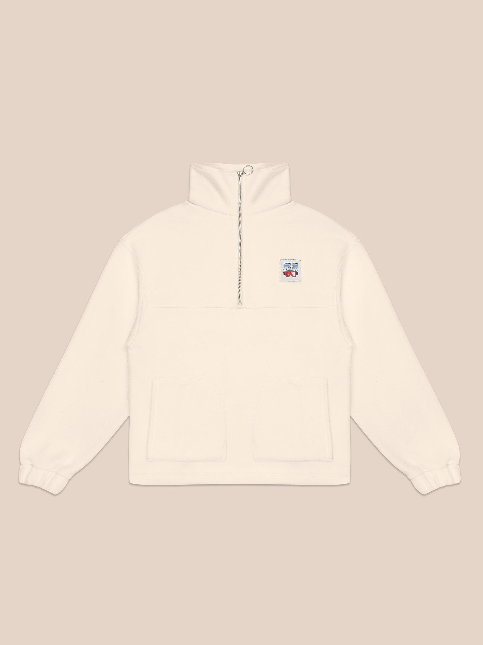 Sudadera blanca oversize con cremallera frontal y detalle de parche en el pecho, una prenda versátil que combina comodidad y estilo con un aire moderno.