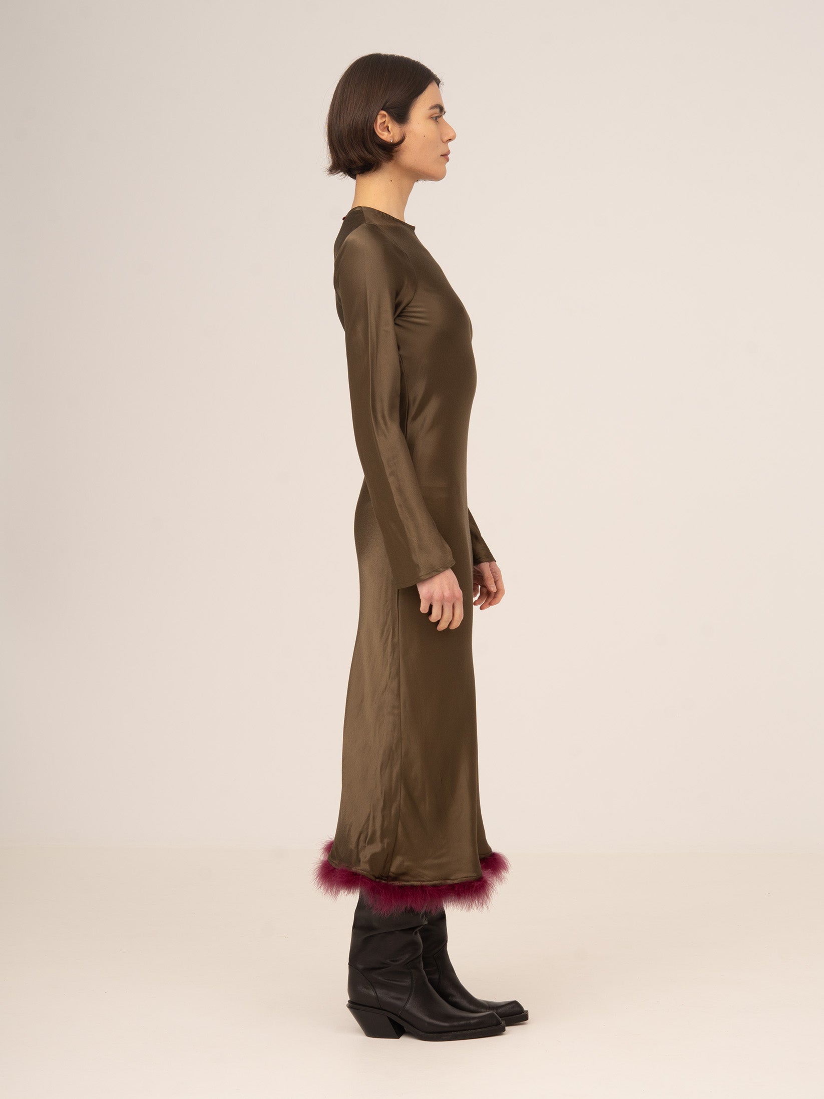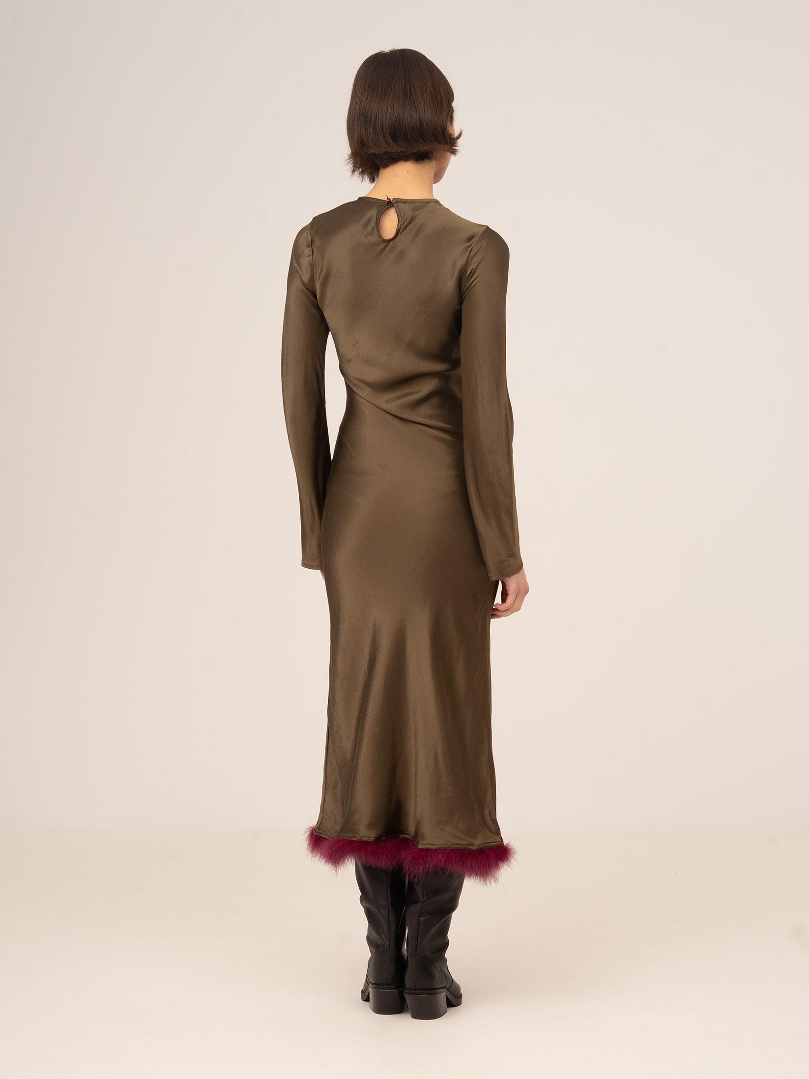 Vestido midi marrón elegante con detalle de plumas en el bajo, una pieza sofisticada que aporta movimiento y un toque distintivo.