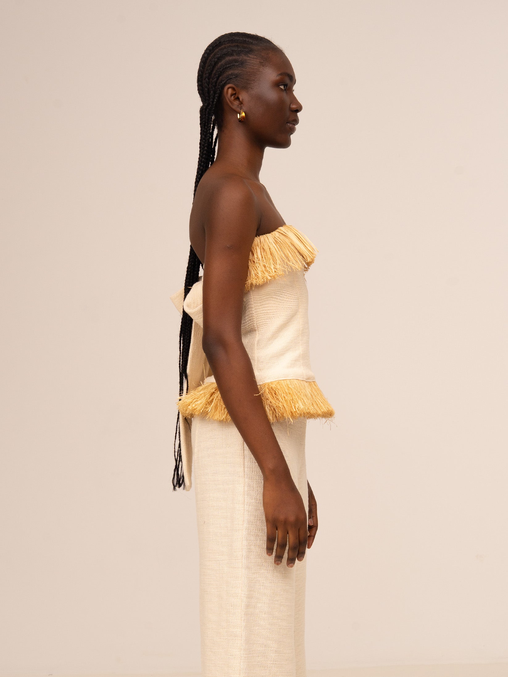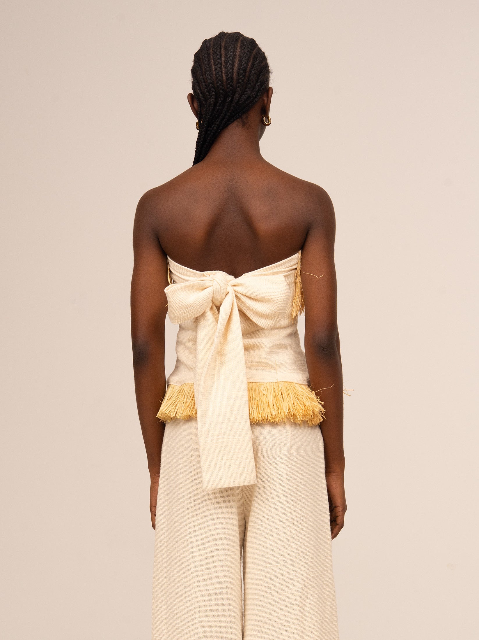 Top palabra de honor con flecos de paja y corte entallado. Diseño ligeramente ajustado con escote recto y silueta definida. Confeccionado en tejido rústico en tono crema. Detalle de flecos de paja en escote y bajo que añade movimiento. Detalle de lazada en espalda. Cierre mediante cremallera invisible lateral.