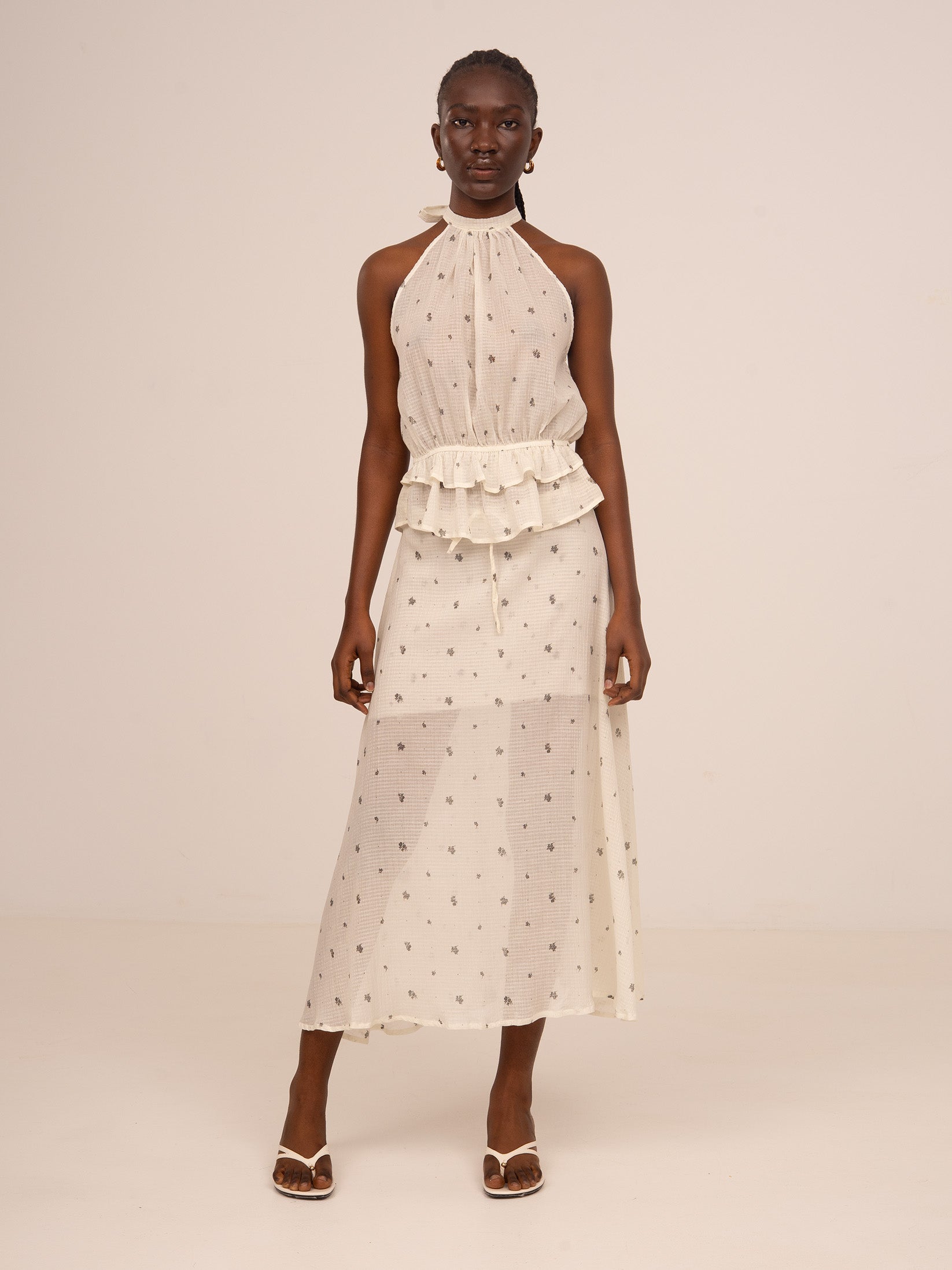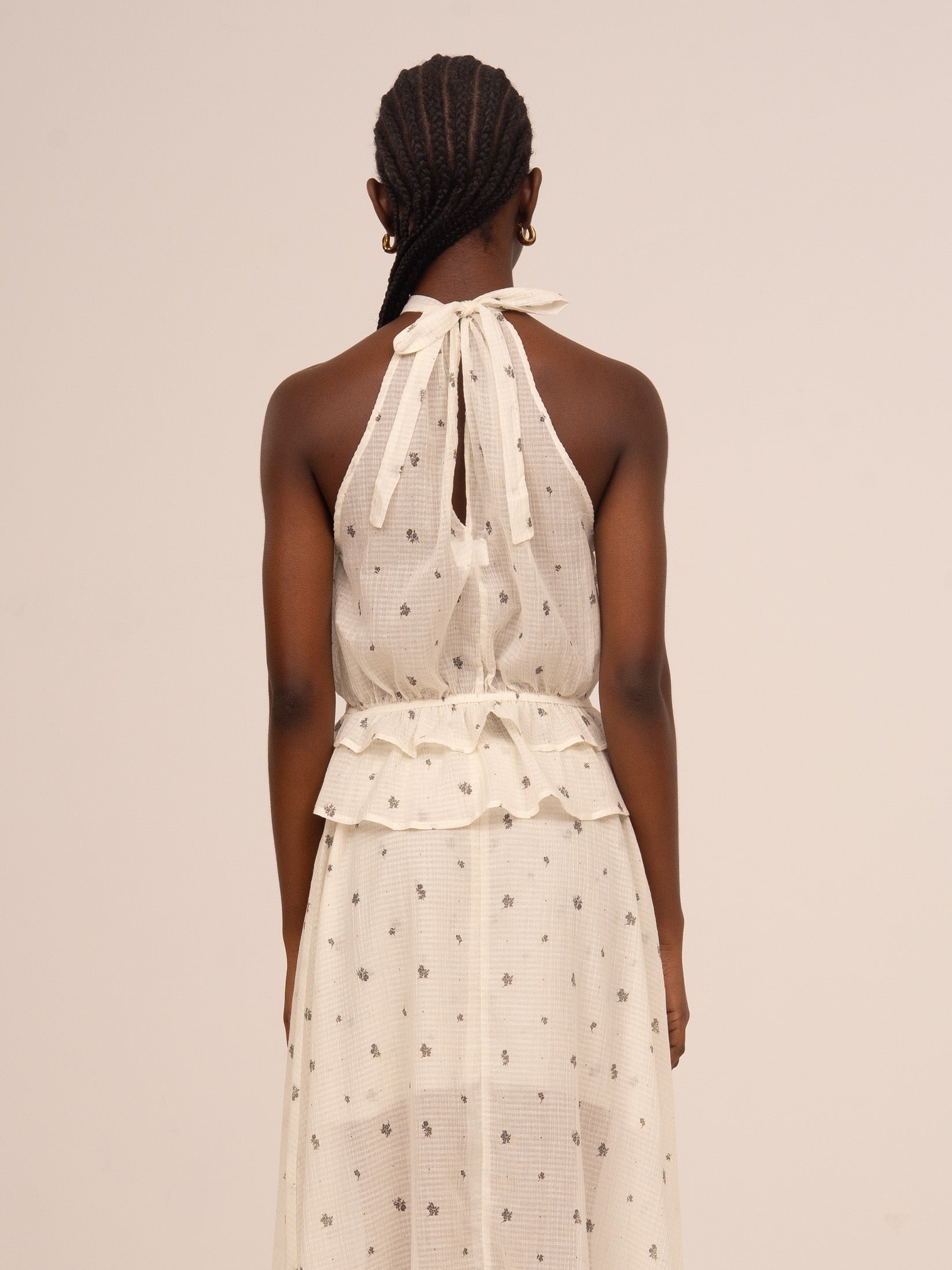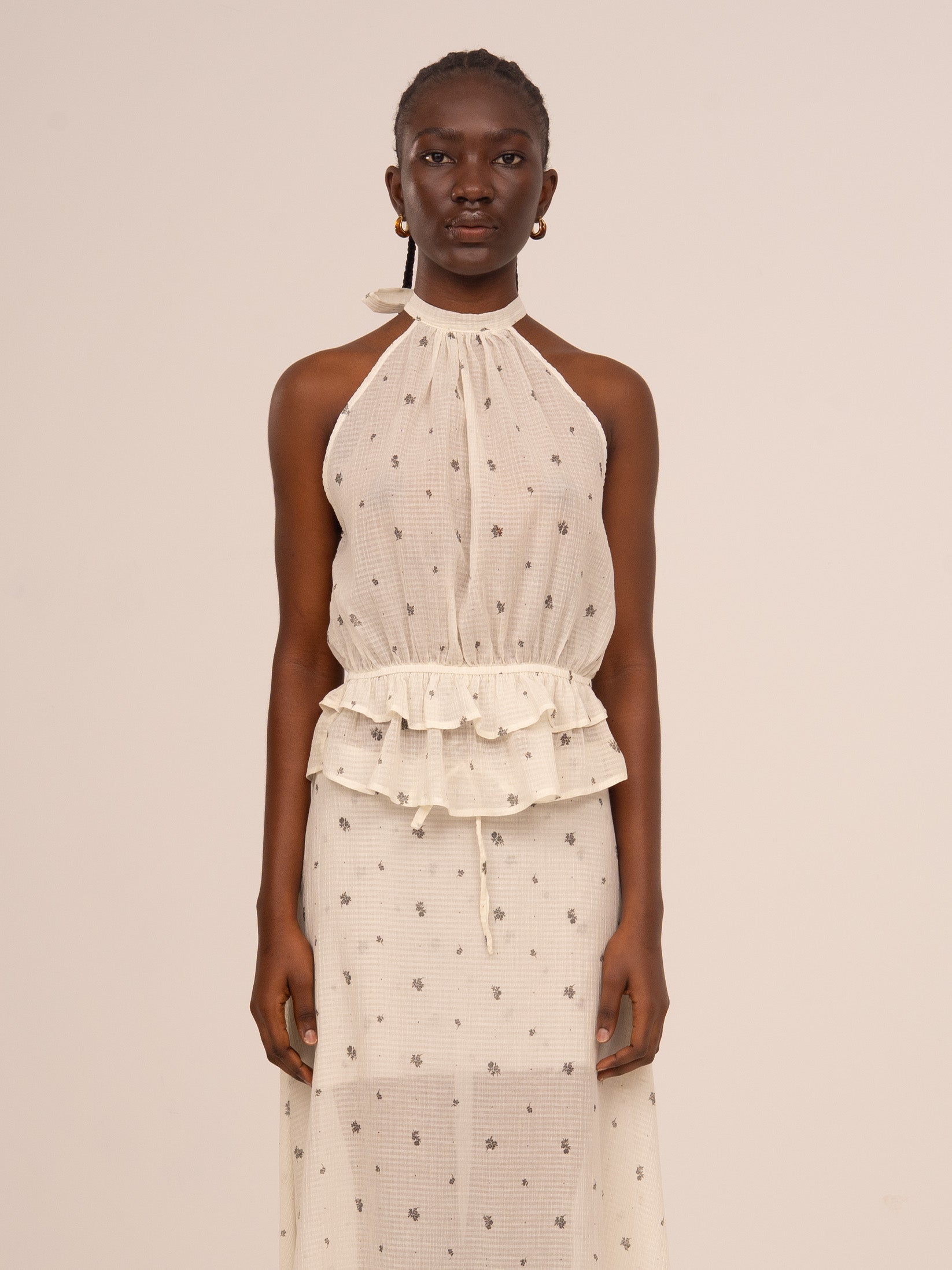 Top halter en tejido ligero con estampado floral. Diseño de cuello alto con frunce y sin mangas. Bajo con volantes. Cierre espalda con lazada.