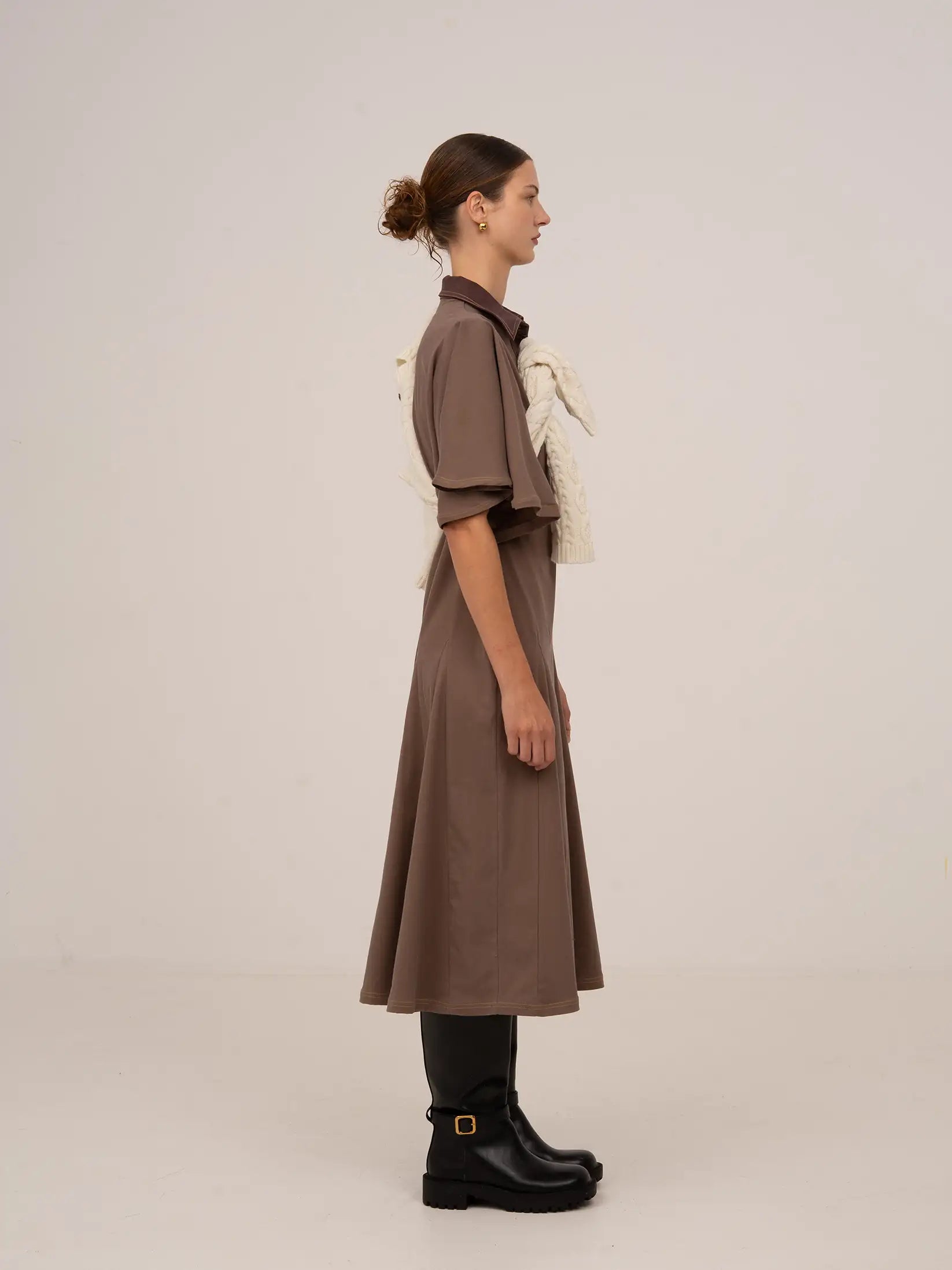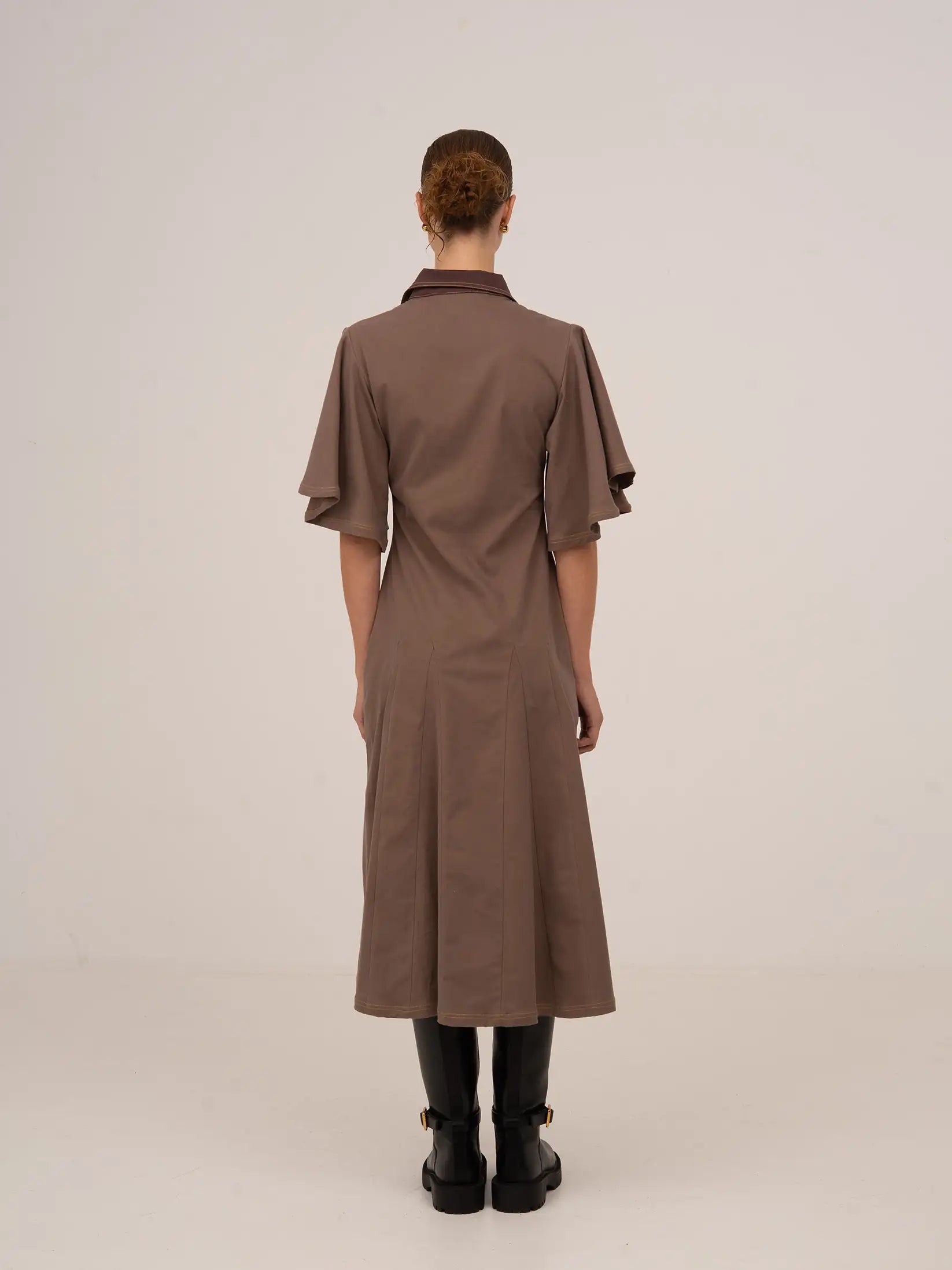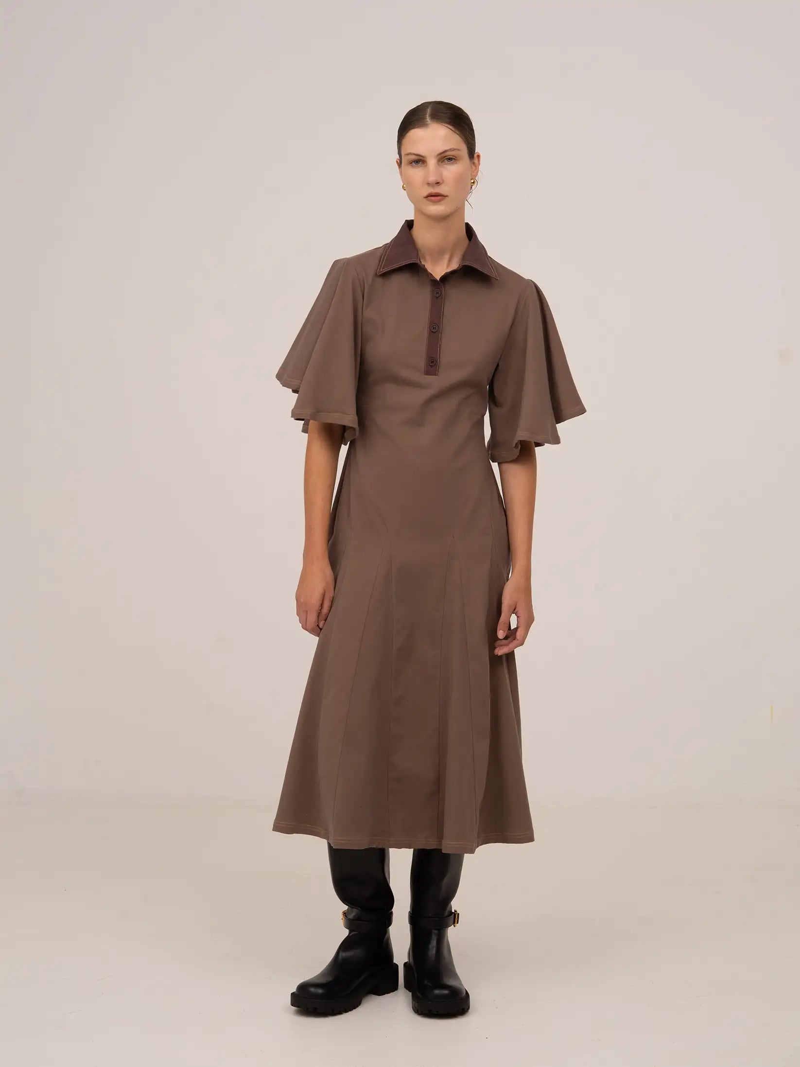Vestido midi marrón elegante con cuello camisero en contraste y mangas tipo capa.