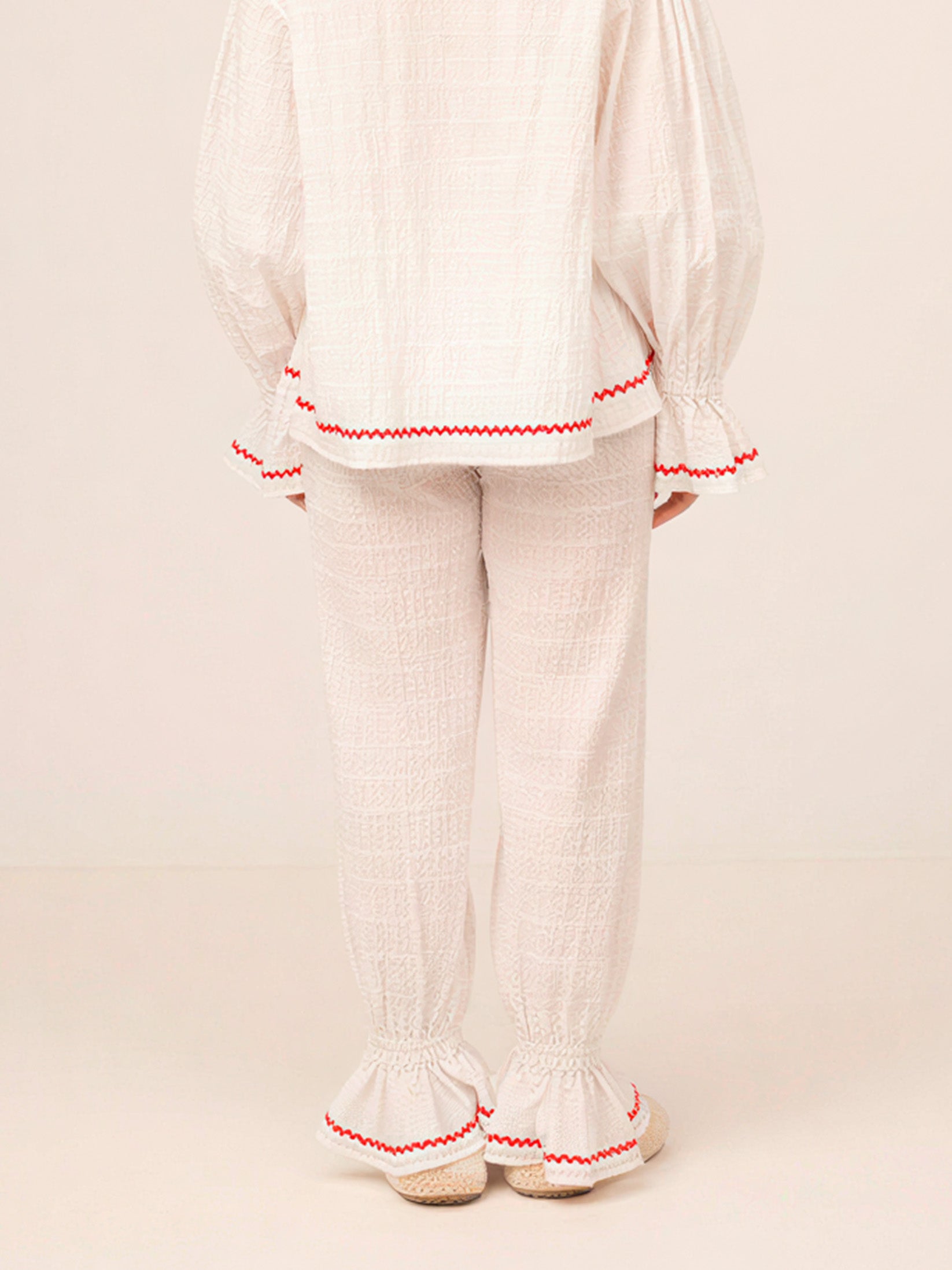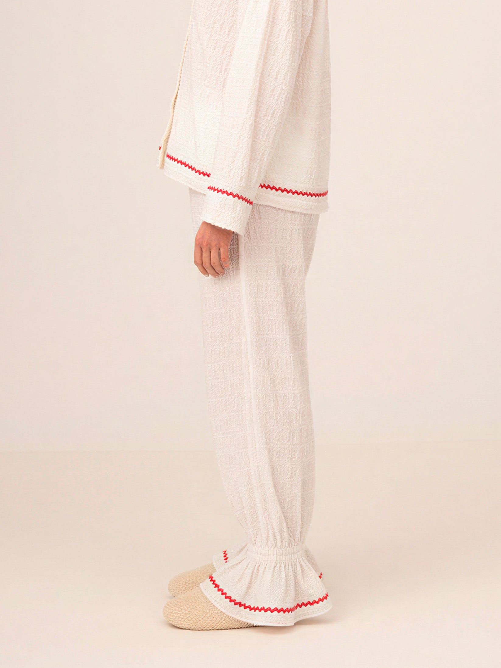 Pantalones pijameros y abullonados en tono crema. Bajo con volante decorativo y detalle de fornitura.