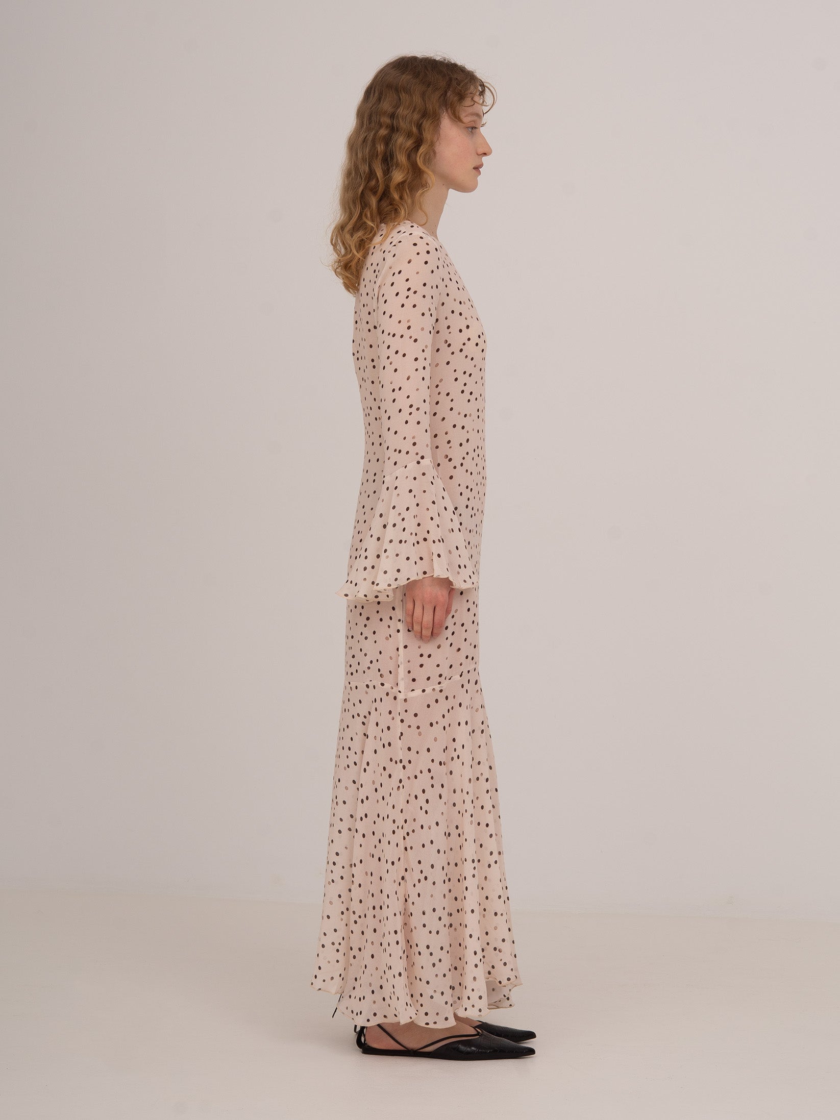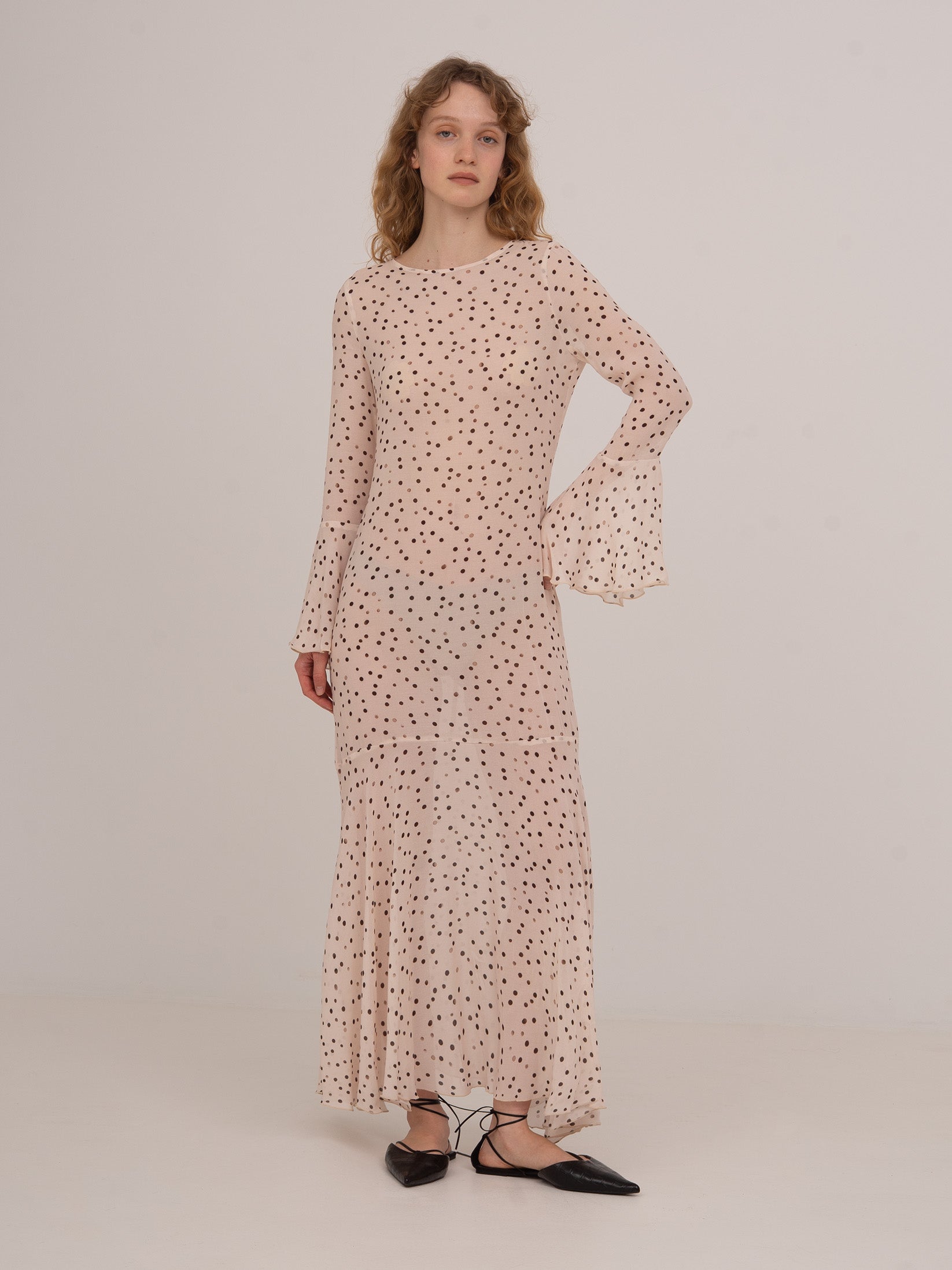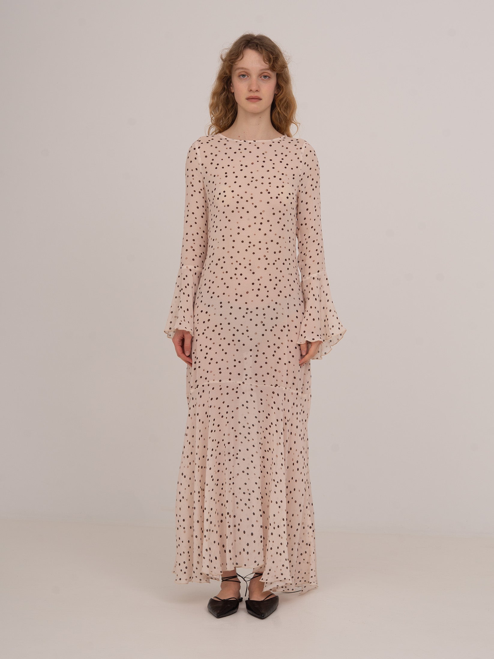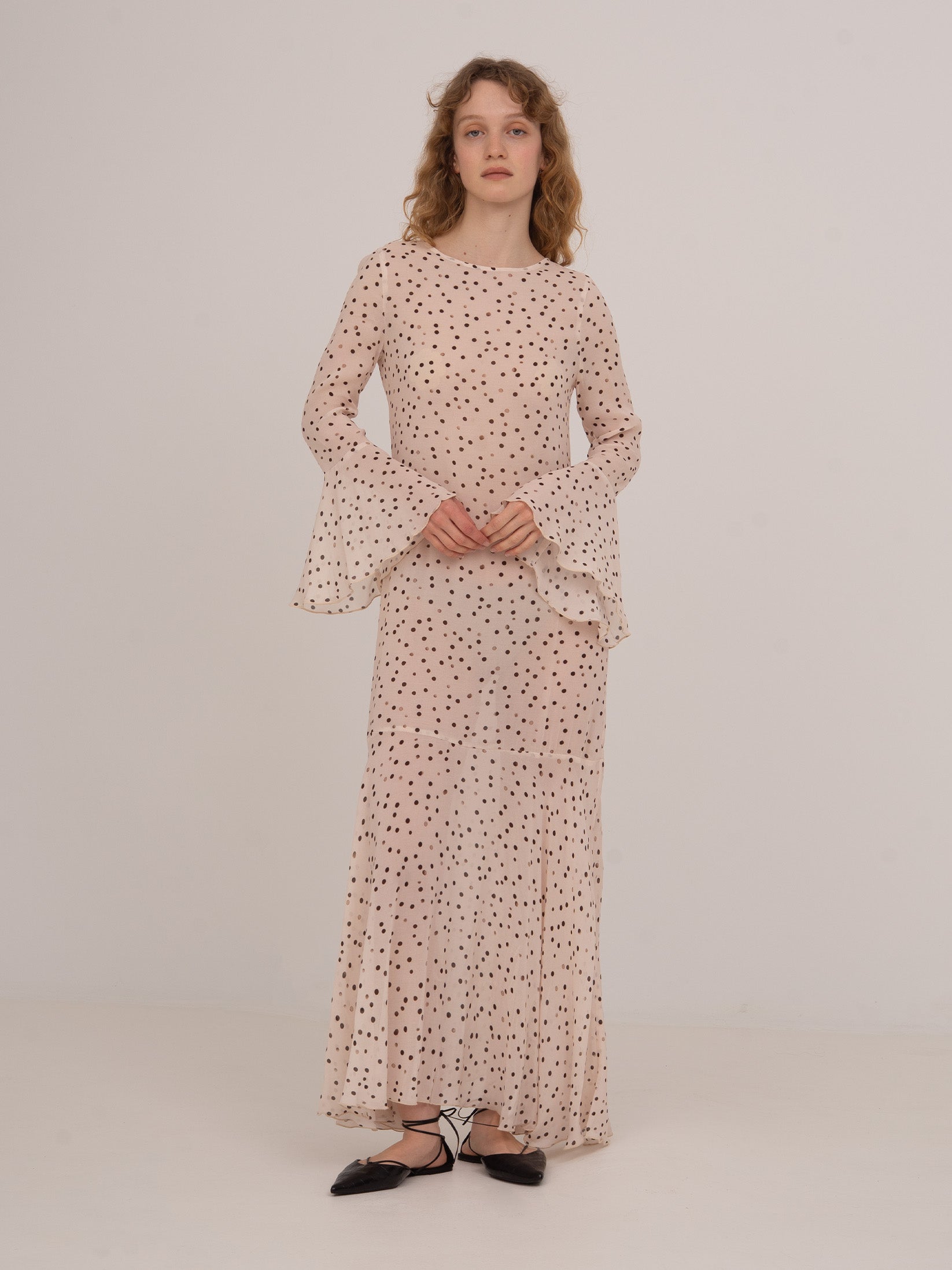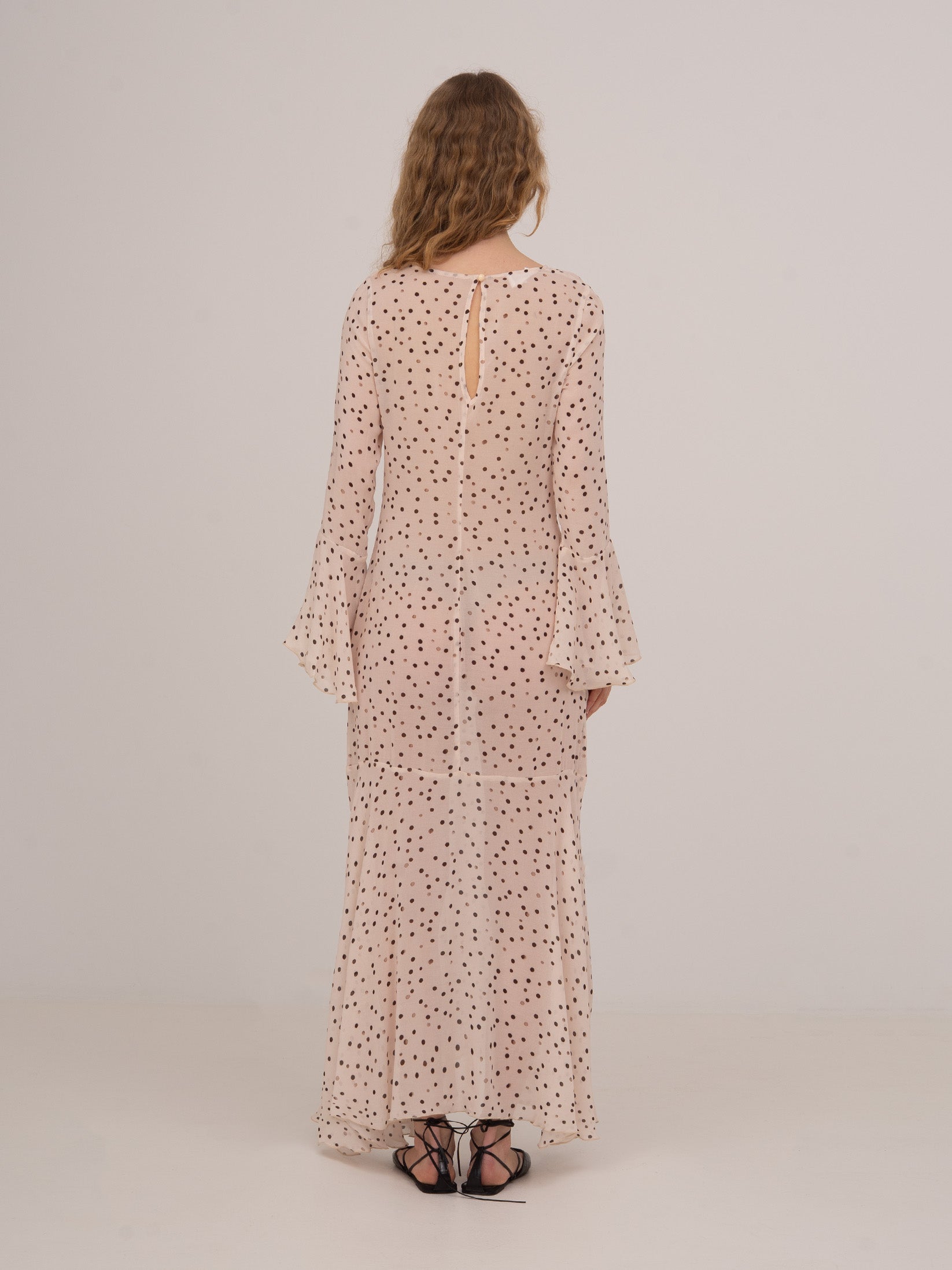 Vestido midi de lunares en tonos marrón sobre fondo melocotón, una propuesta delicada y femenina que destaca por su elegancia natural y su aire romántico.