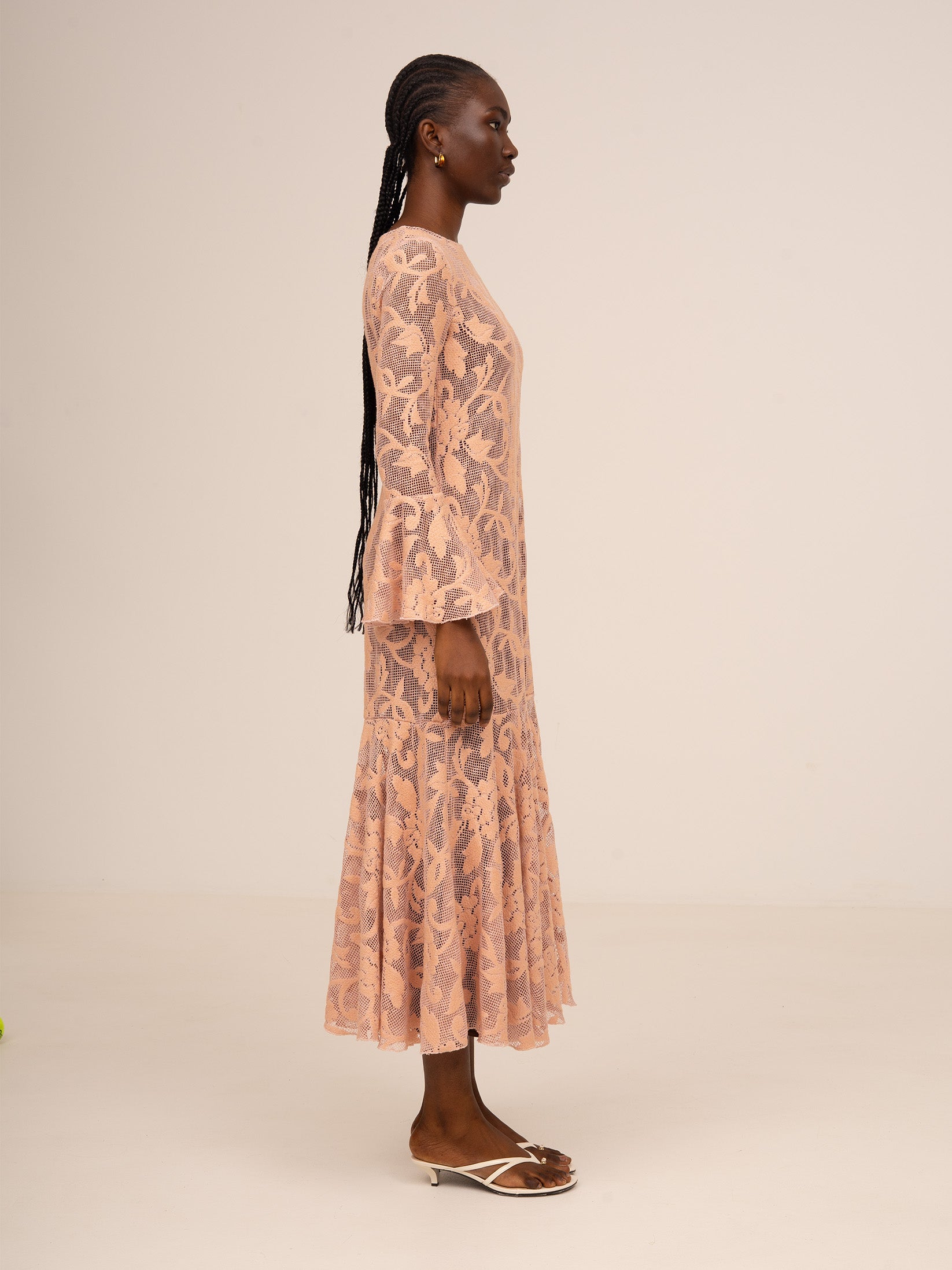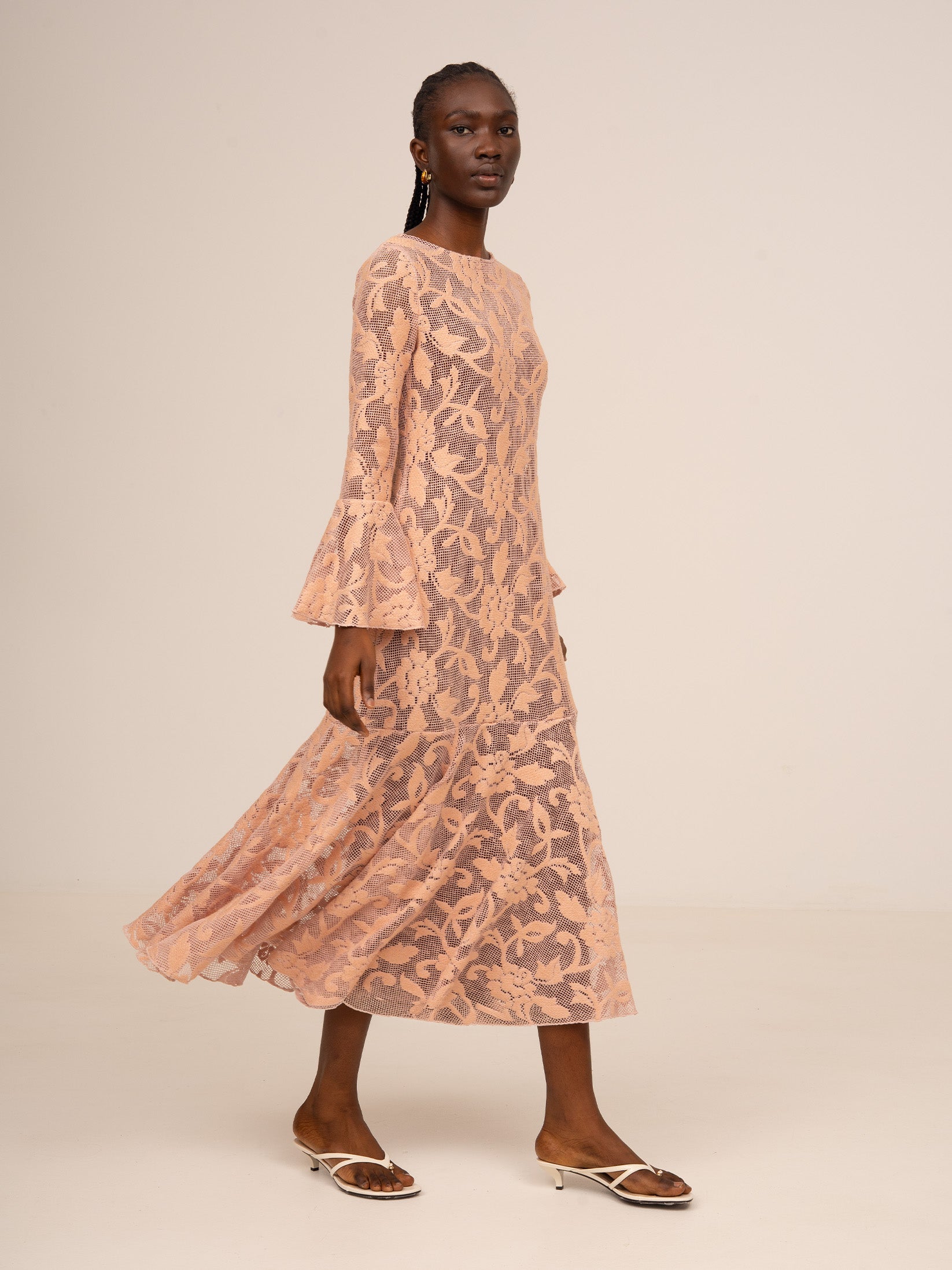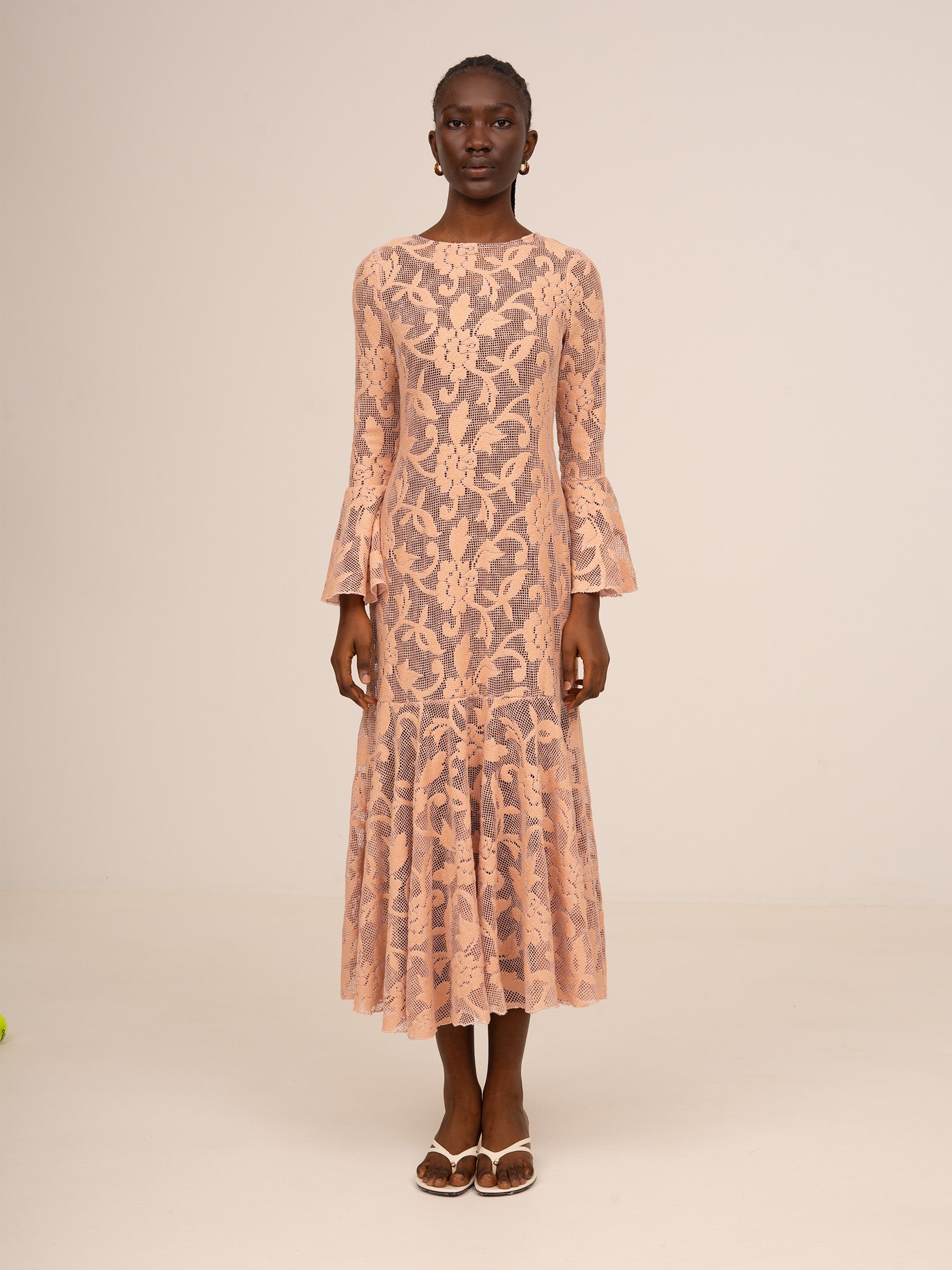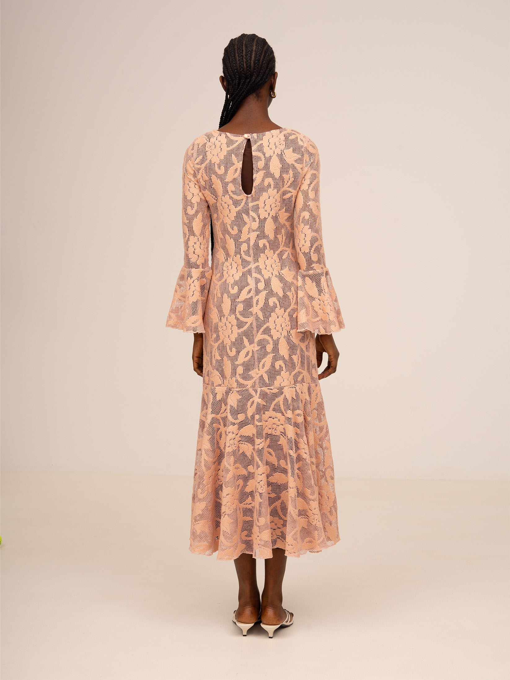Su silueta entallada se equilibra con unas mangas largas de volantes acampanados que aportan movimiento y un aire romántico, mientras que la falda con vuelo sutil estiliza la figura con delicadeza.
