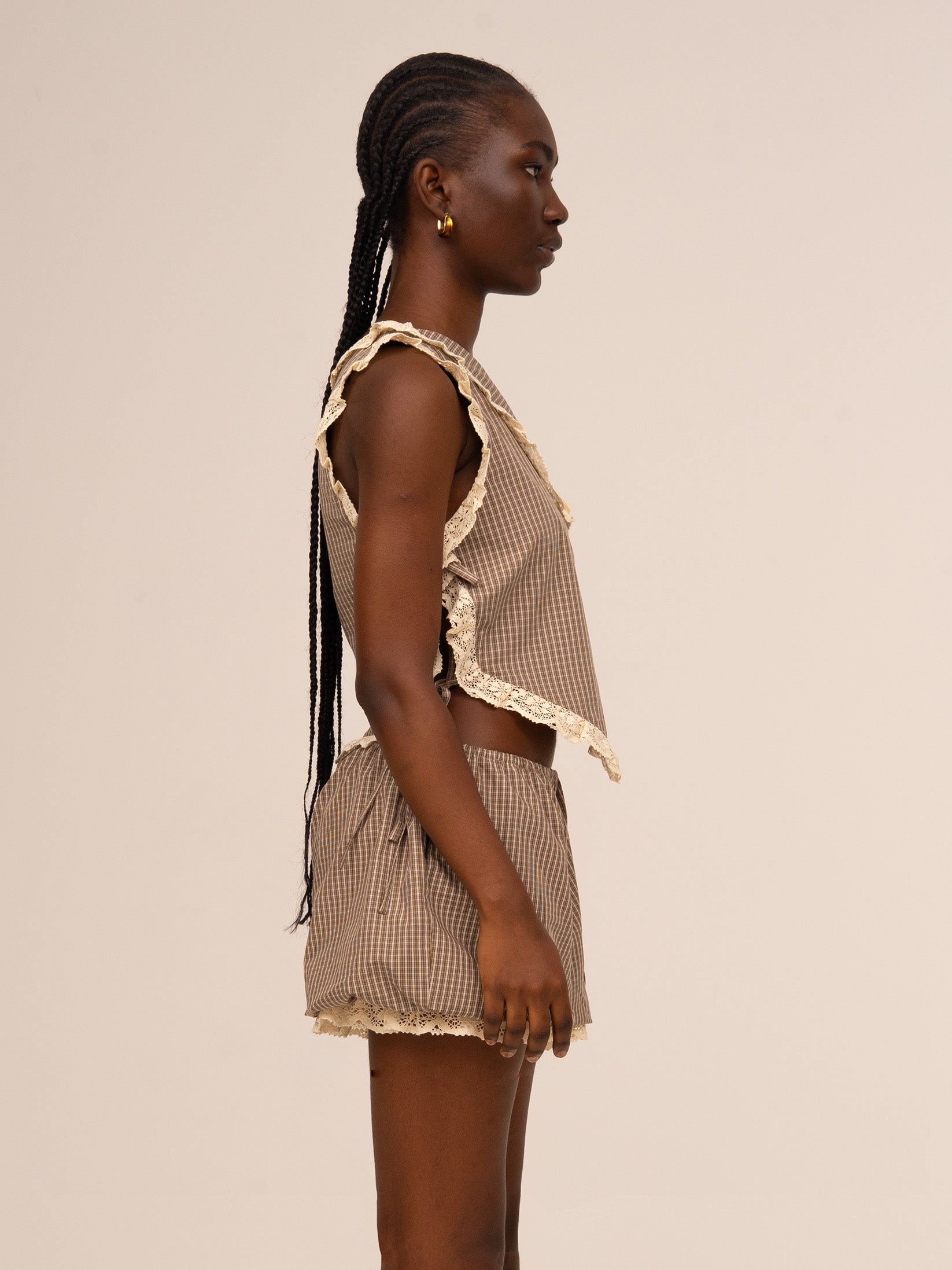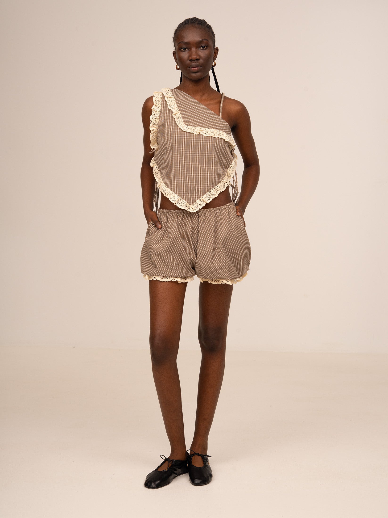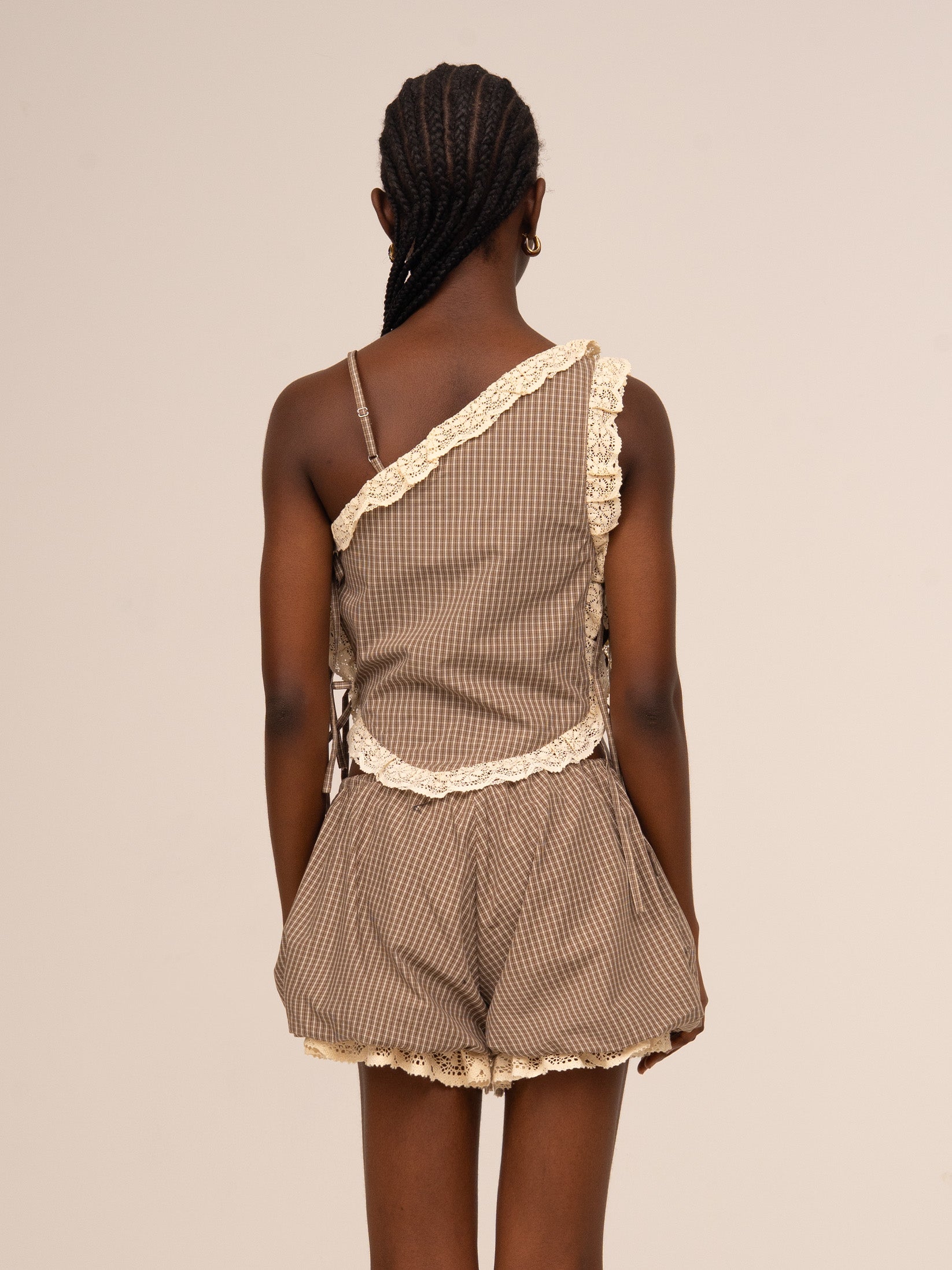 Top asimétrico en tejido de cuadros con volantes en puntilla. Diseño de corte fluido con un solo tirante fino y capa superior con puntilla. Confeccionado en tejido de cuadros en tonos marrones con acabado ligero.