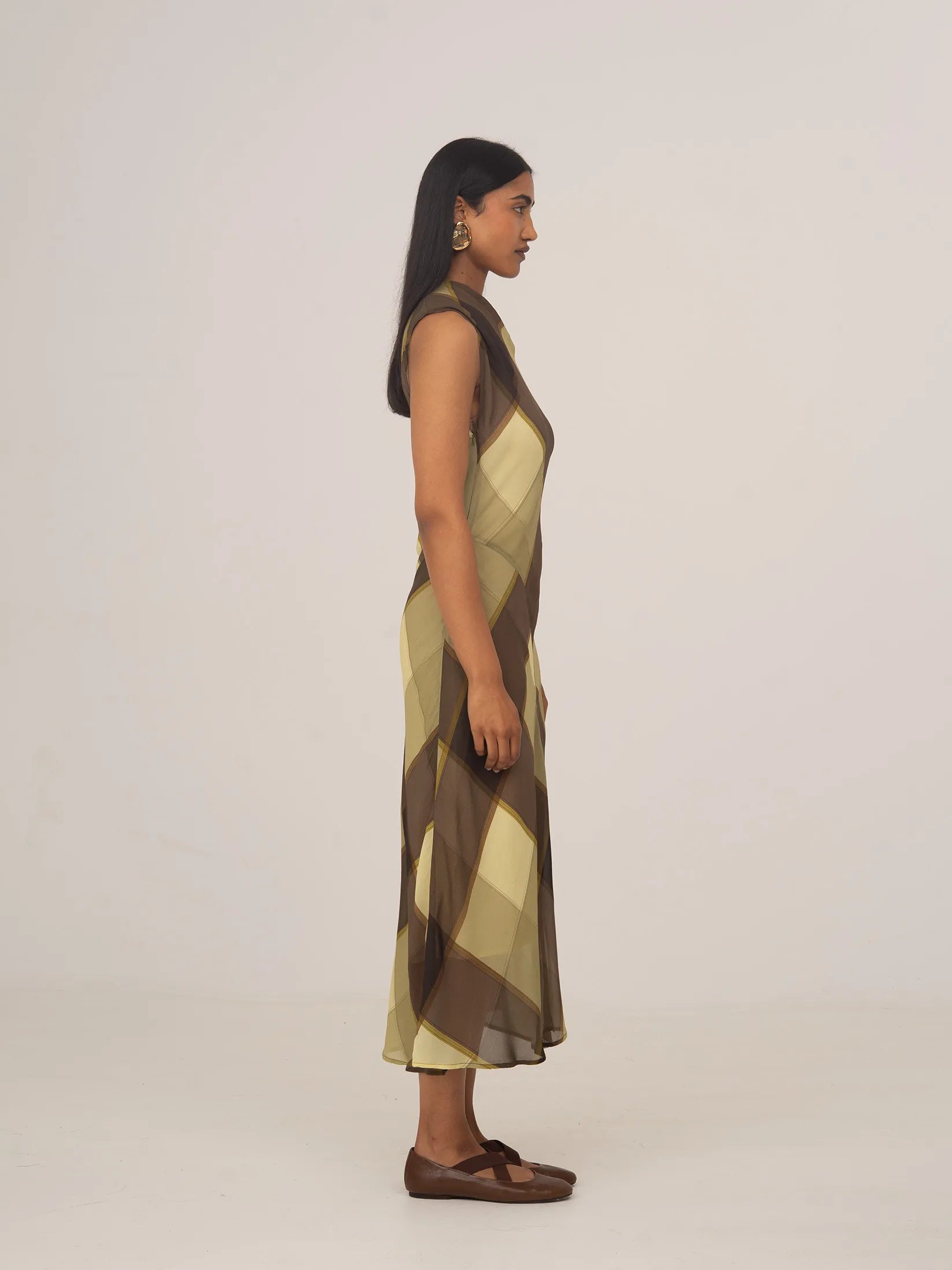 Perfecto para bodas, cócteles o cenas elegantes, este vestido de cuadros grandes en tonos tierra aporta un aire distinguido y versátil, logrando un look impactante y refinado.