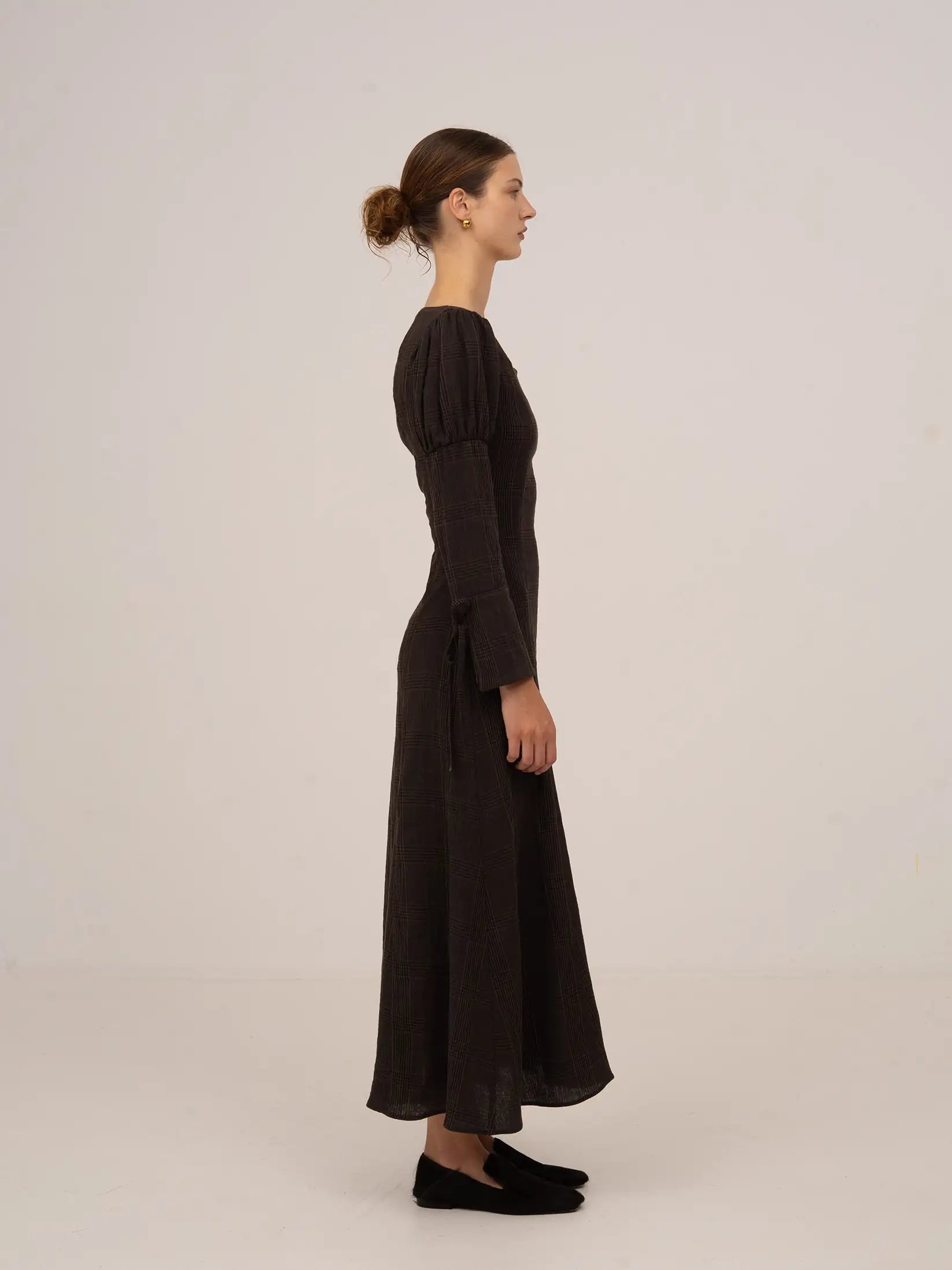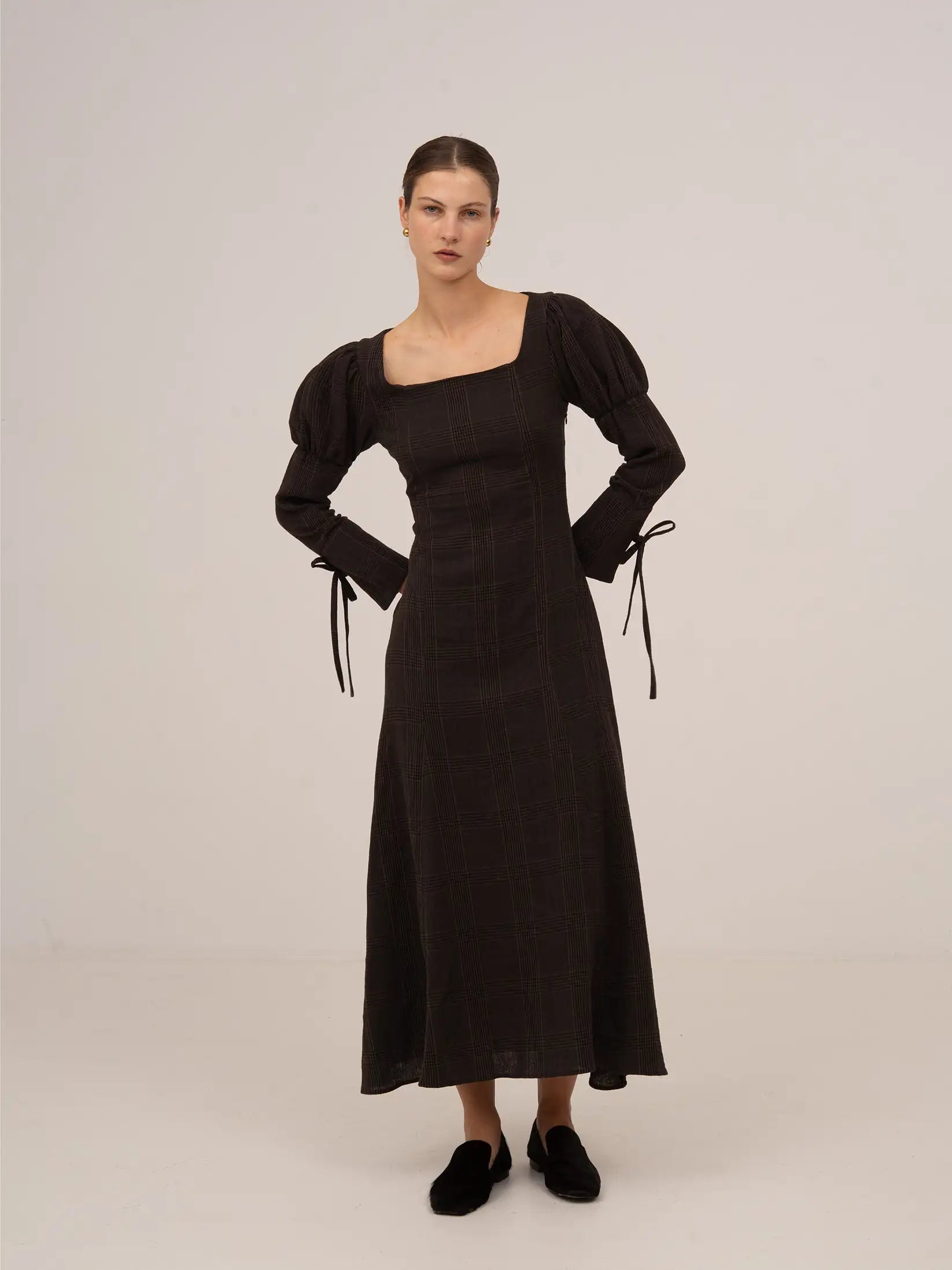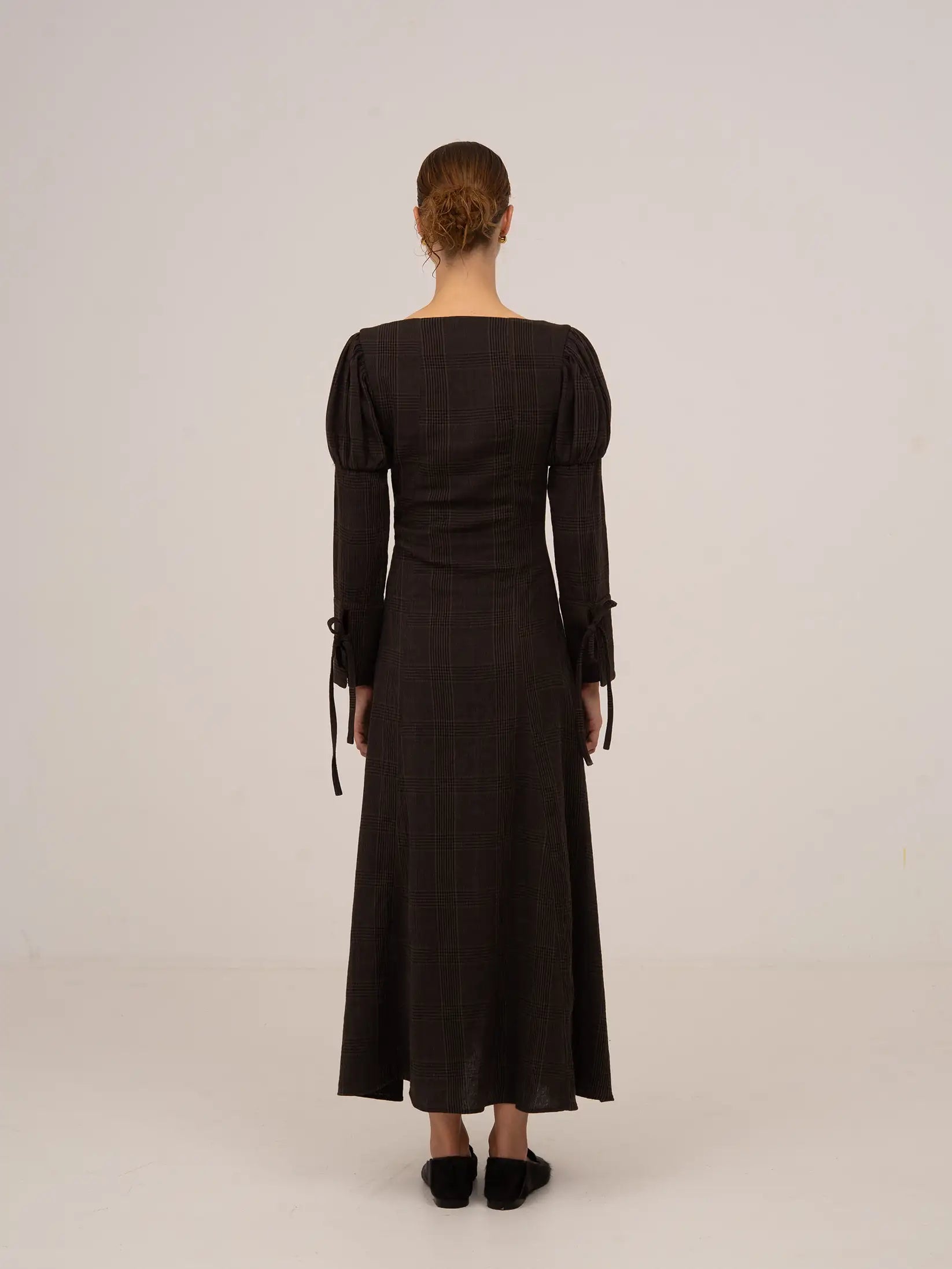 Vestido maxi de cuadros marrón con escote cuadrado y mangas abullonadas.