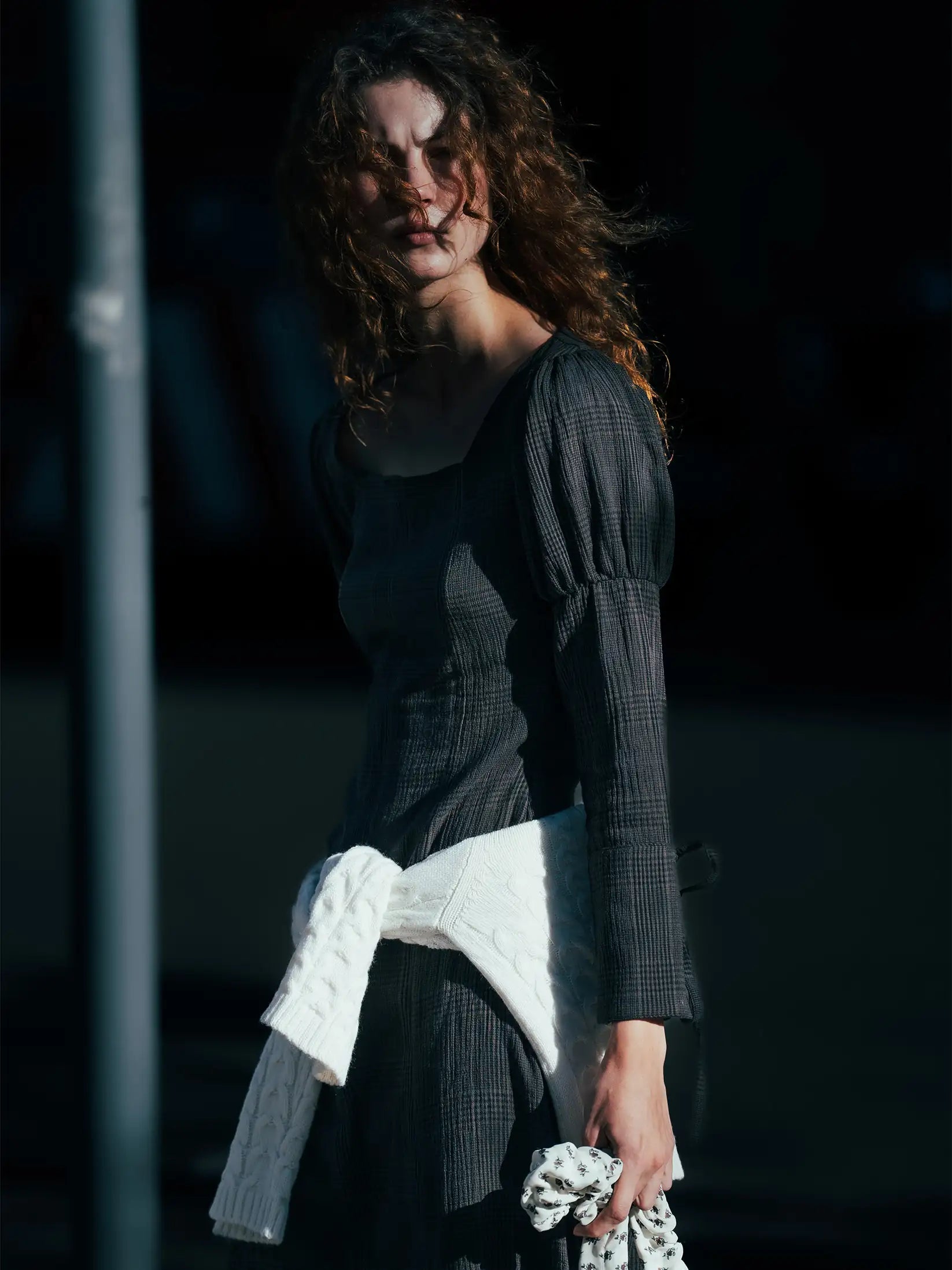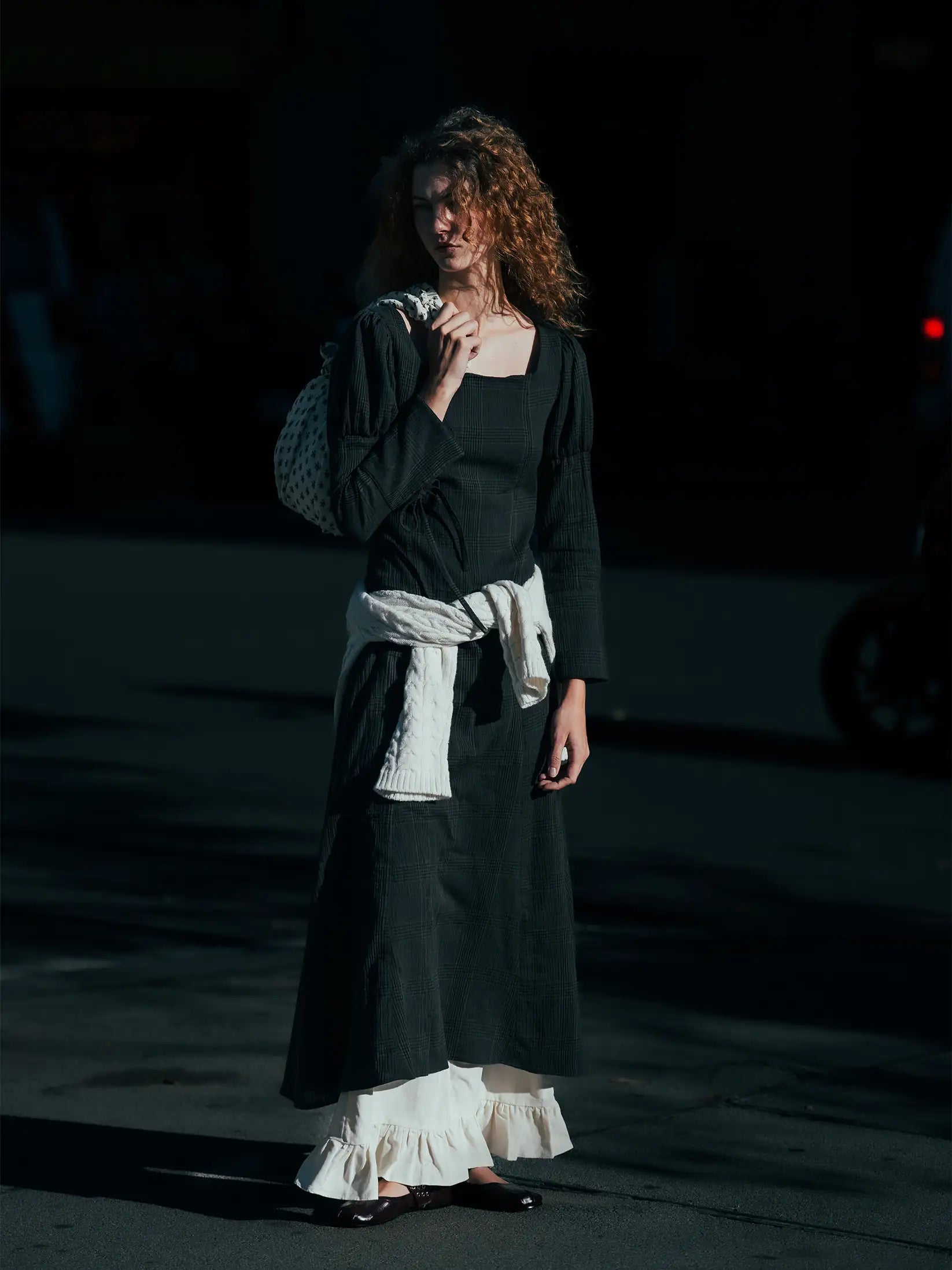 Este vestido largo combina la calidez del tono marrón con un elegante estampado de cuadros, creando una silueta femenina y actual. Su escote cuadrado y los hombros abullonados aportan un aire romántico, mientras que el bajo fluido con abertura lateral y lazadas en los puños añaden movimiento y sofisticación. Confeccionado en un tejido ligero y cómodo, se ajusta delicadamente a la cintura para realzar la figura. Perfecto para eventos de día, cenas o looks de entretiempo con un toque refinado y atemporal.