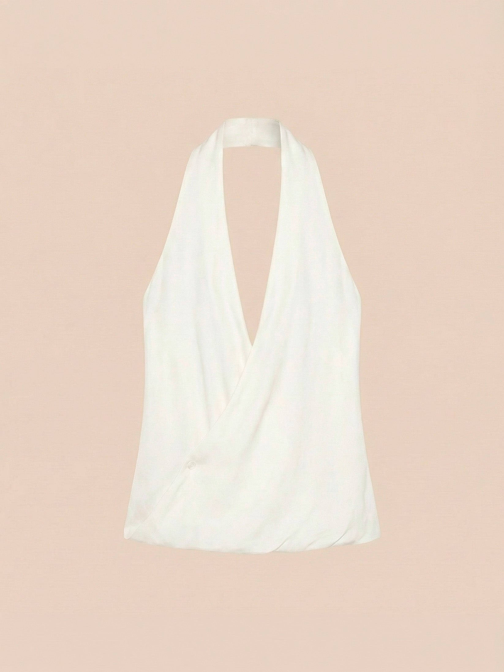 Top halter en tono blanco con diseño cruzado y escote drapeado. Confeccionado en tejido elástico, sin mangas y con caída fluida.