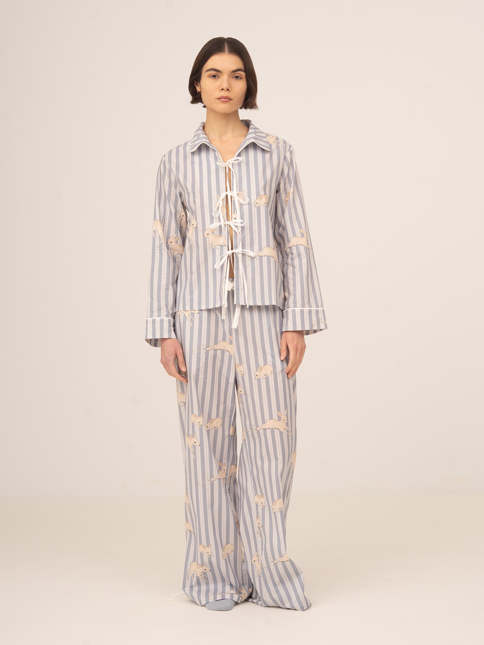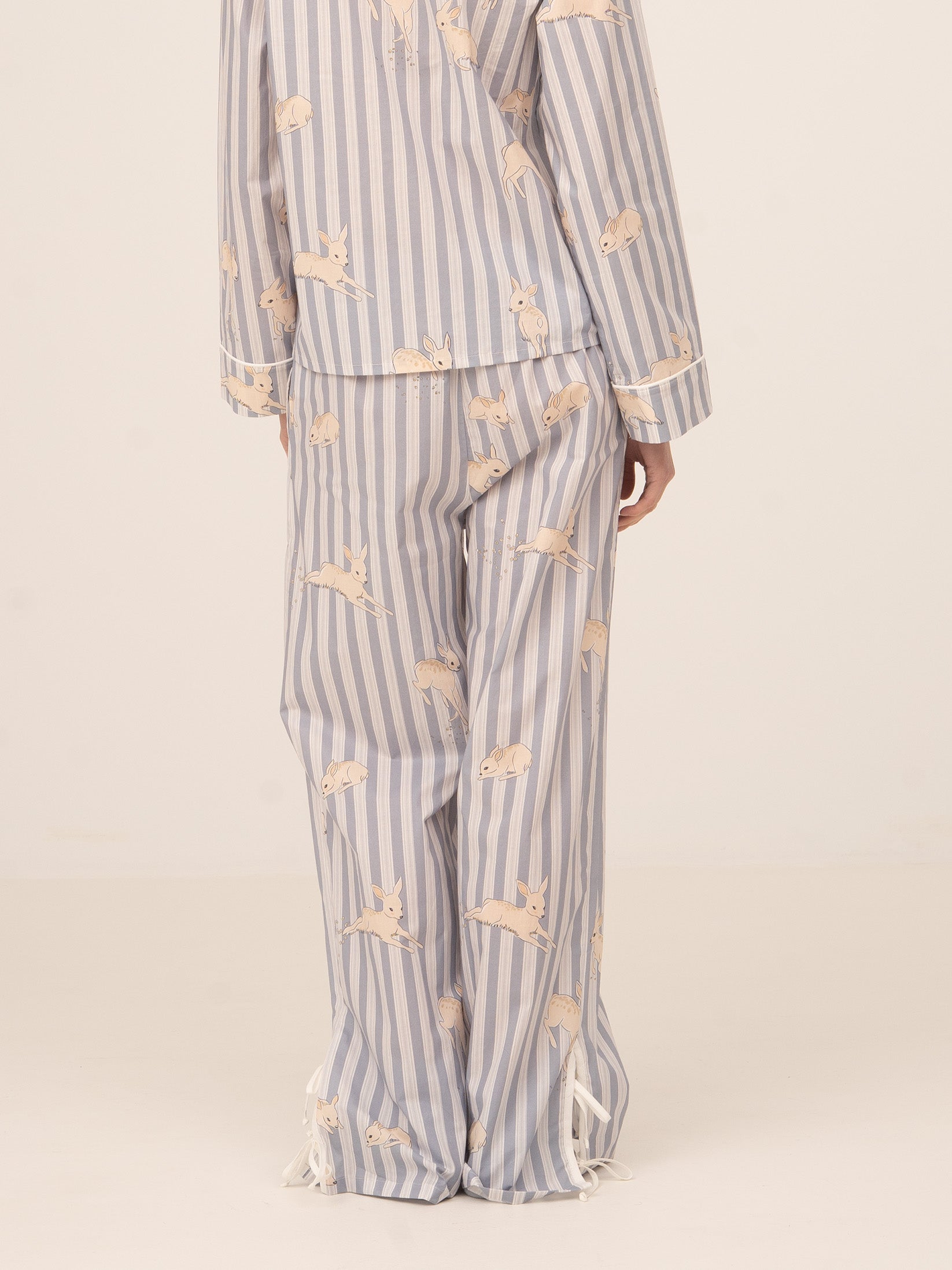 Pantalones pijameros de rayas azules con dibujos de ciervos. Detalle de abertura en bajos laterales y cierre mediante lazada.