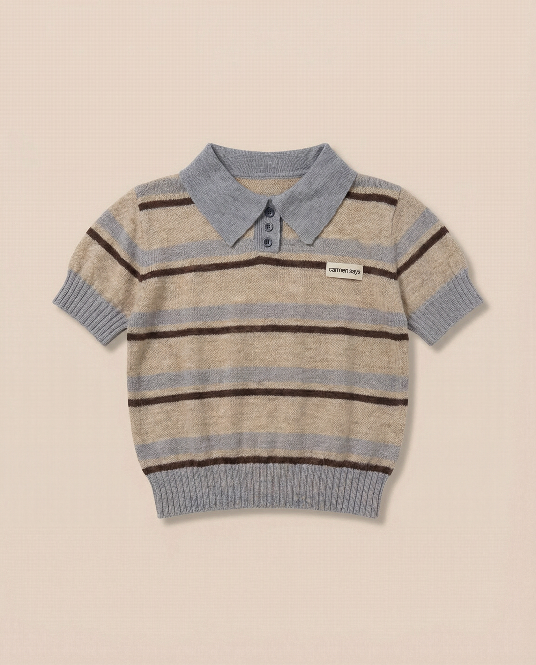 Cuenta con cuello tipo polo y tapeta frontal con botones que aportan estructura y elegancia. El bajo y las mangas presentan terminaciones acanaladas que estilizan la silueta y mejoran el ajuste. Como detalle distintivo, incorpora etiqueta CARMEN SAYS en el pecho.