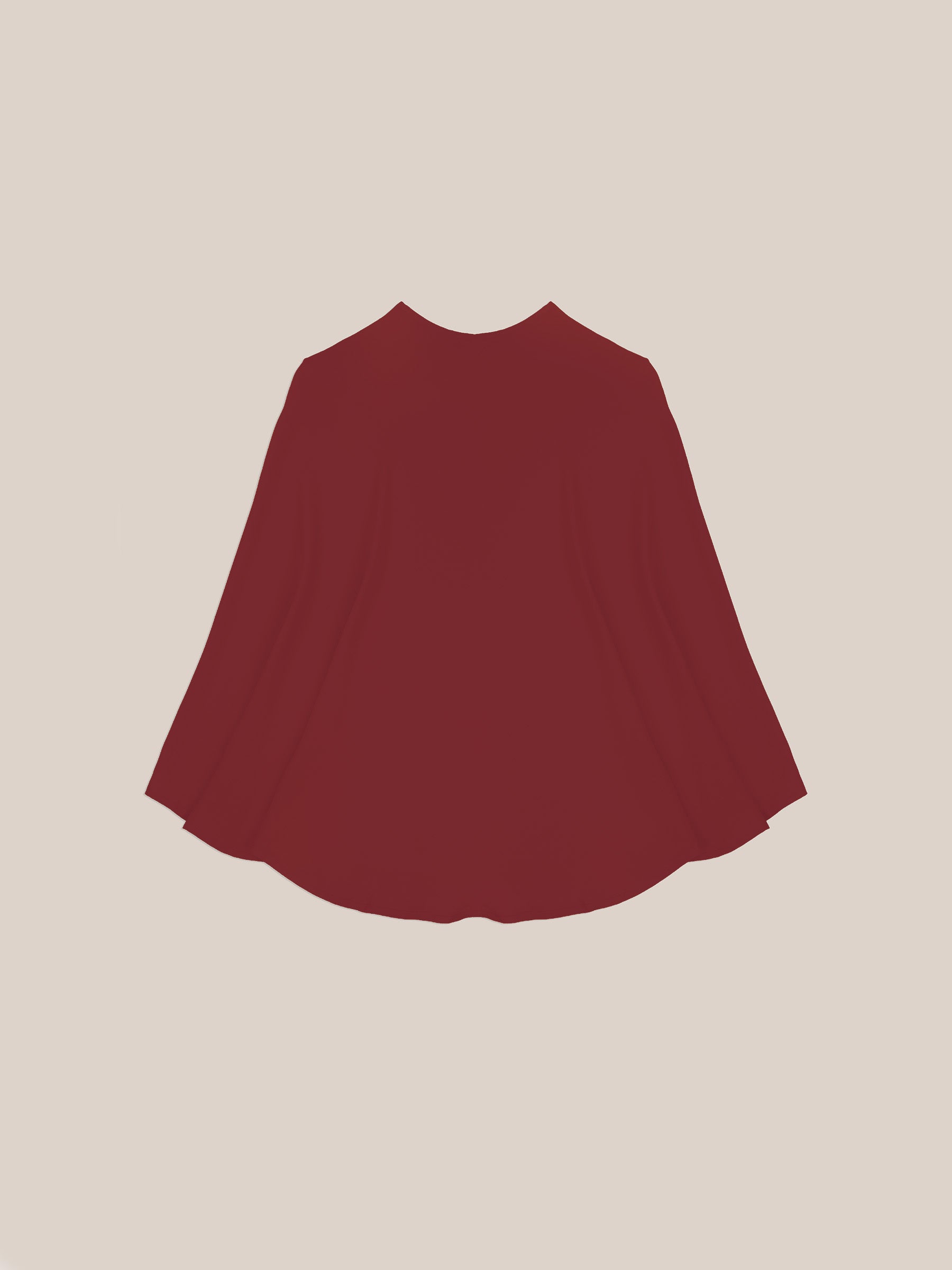 Con un diseño envolvente y minimalista, esta capa destaca por su silueta fluida y su cierre en la espalda mediante lazada, que añade un detalle delicado y femenino. El tono burgundy aporta sofisticación y calidez, convirtiéndola en una prenda versátil que realza cualquier look con un aire refinado y contemporáneo.